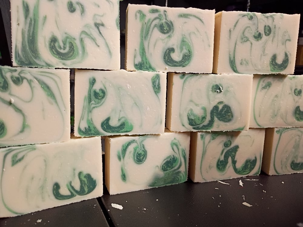 Olive oil, tallow, water, coconut oil, lye, castor oil, Shea butter. Essential oil, mica