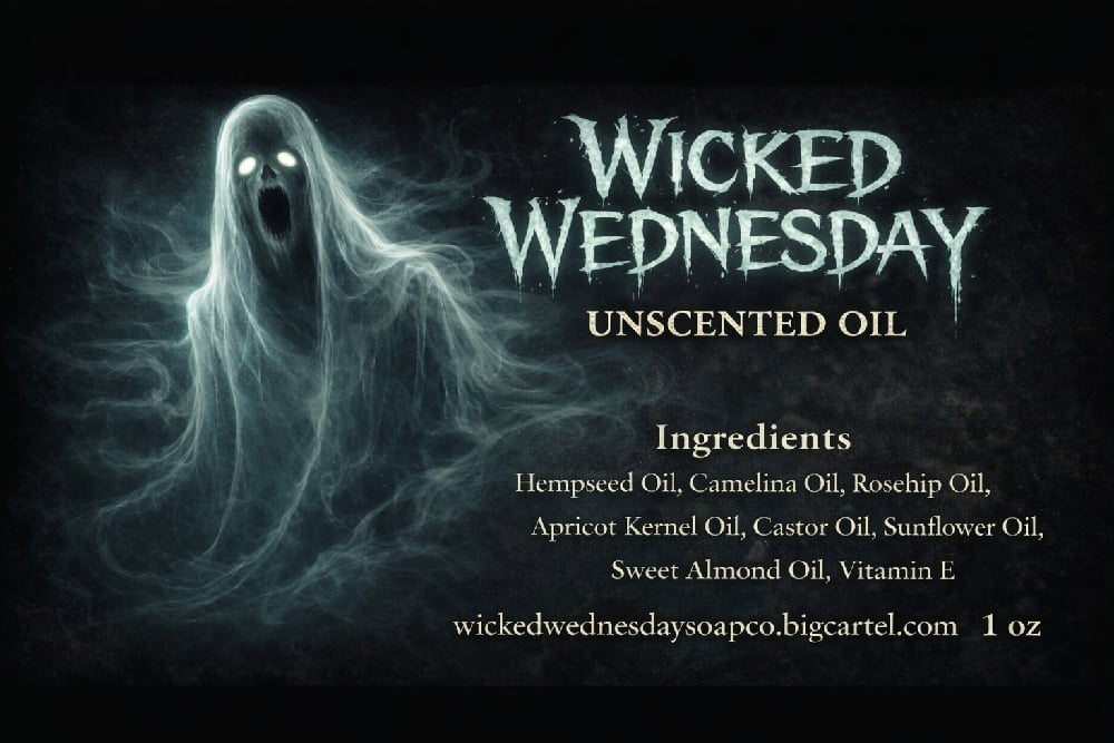 Wicked Wednesday Unscented Oil is darkness done with restraint — no loud fragrance, no distractions, just pure, intentional formulation wrapped in ghostly elegance. It carries that signature haunted energy, but in a quieter way… like a whisper in a candlelit apothecary. The icy specter on the label sets the mood — mysterious, powerful, untouchable — while the clean, carefully chosen blend of hempseed, camelina, rosehip, apricot kernel, castor, sunflower, sweet almond, and vitamin E speaks to sophistication beneath the shadows. It’s moody without being messy, bold without being brash. Classy… but undeniably wicked. 🖤